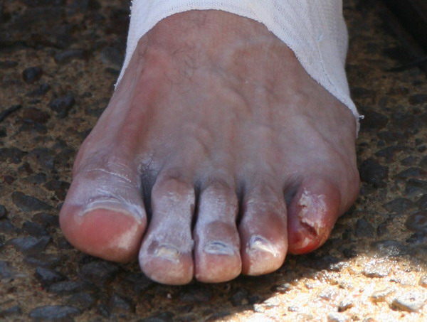 Vous n’êtes pas obligé de les martyriser pour arriver à ce point. Il suffit quelquefois d’avoir le pied grec (orteil plus court que les autres), une peau fragile et de commettre des erreurs de débutant genre chaussures (presque) neuves pour partir avec un amorti maximal.
